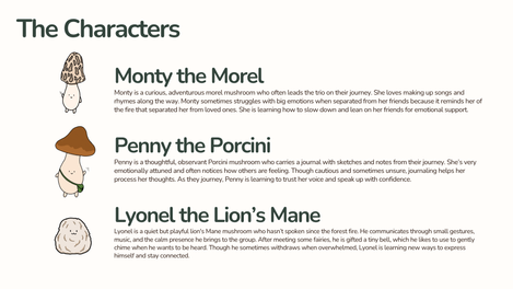 Mushroom Pals is a transmedia storytelling strategy developed for my graduate course Visual Storytelling in the University of Washington’s Communication Leadership program. This storytelling strategy is designed to support children’s emotional growth through mindfulness, nature, and imaginative play. Starting as a printed comic, the project follows three mushroom friends on a journey of healing after a forest fire, and expands across a website, YouTube channel, and plush toys, each offering calming tools and interactive experiences for kids ages 5–8 and their caregivers. Read the full deliverable by clicking under "Link."